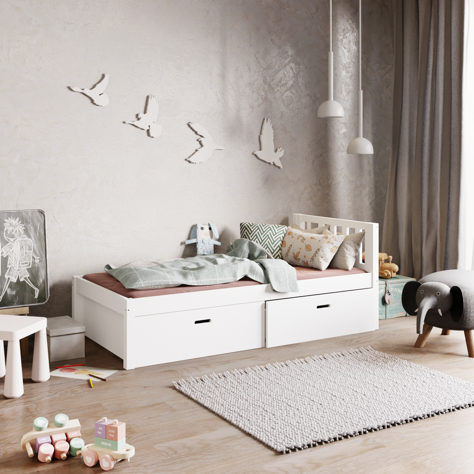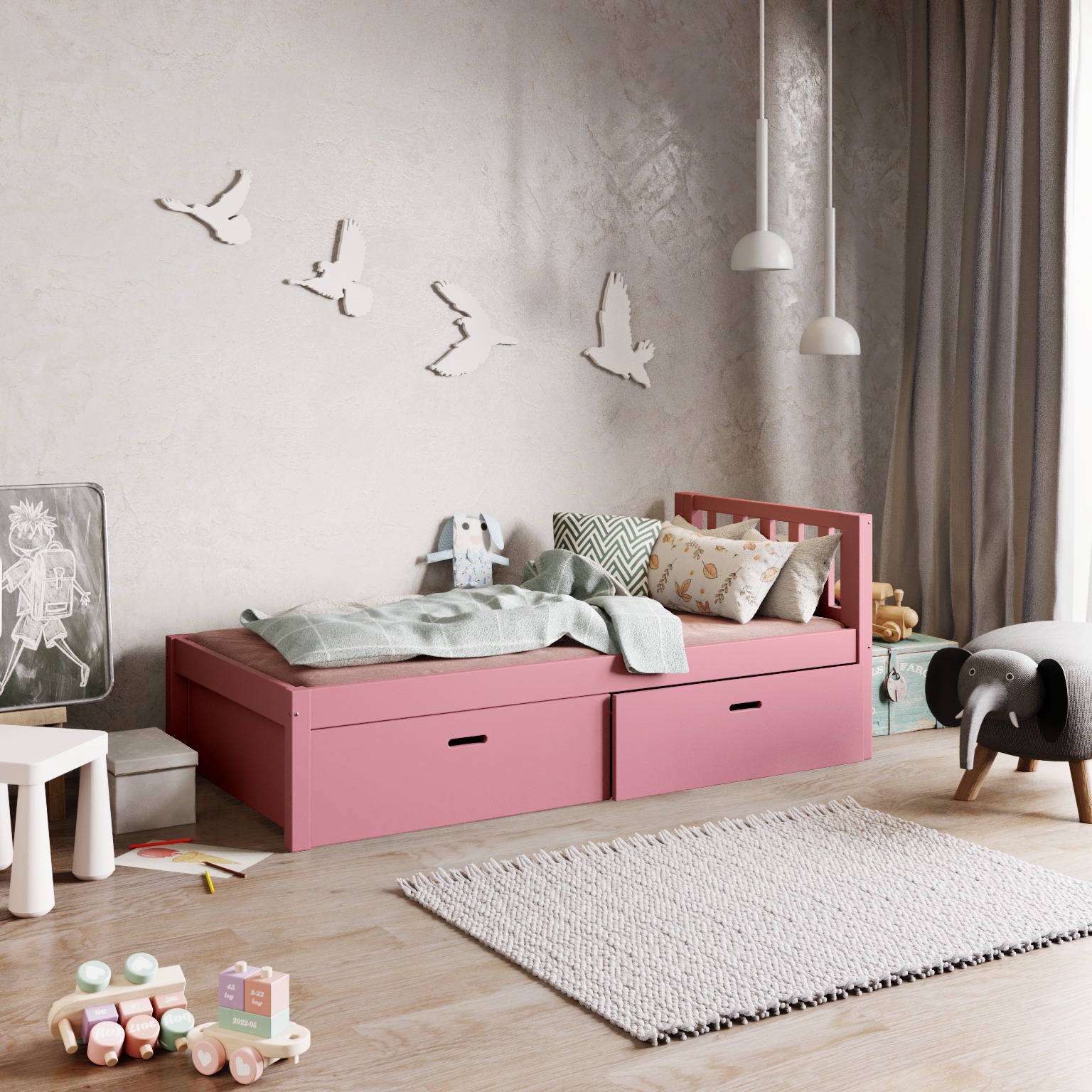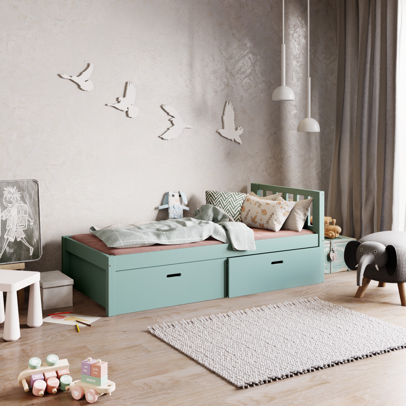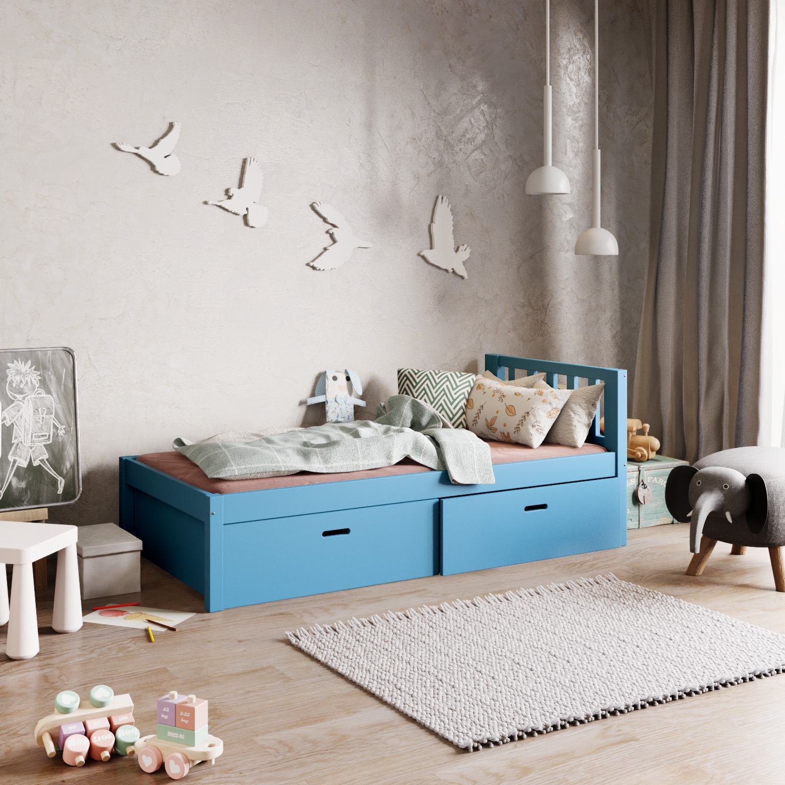Pojemne szuflady umieszczone pod łóżkiem pozwalają na przechowywanie pościeli, ubrań i innych drobiazgów, pomagając utrzymać porządek w pokoju.