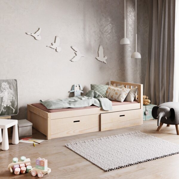 Drewniane łóżeczko Classic z szufladami to połączenie klasycznej formy i praktycznych rozwiązań. Prosta bryła wzbogacona o pojemne, wysuwane szuflady nie tylko zapewnia komfortowy sen, ale także dodatkowe miejsce do przechowywania. Wykonane z solidnego drewna sosnowego, łóżeczko nawiązuje do ponadczasowego designu, który doskonale pasuje do każdego dziecięcego pokoju – wystarczy wybrać odpowiedni kolor, aby stworzyć wymarzoną przestrzeń. Proste, minimalistyczne wykończenie daje szerokie możliwości dekoracyjne: dodaj lampki, kolorową pościel, ulubione zabawki dziecka lub zawieś nad nim baldachim, tworząc przytulny kącik do snu i zabawy.