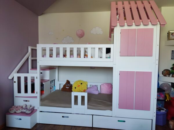 Łóżko piętrowe domek ze schodkami – dla materaca 90×200
