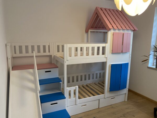 Łóżko piętrowe z schodkami, zjeżdżalnią i szufladami 80×160 cm to doskonały wybór do pokoju dziecięcego, łączący funkcjonalność z zabawą. Wykonane z wysokiej jakości drewna sosnowego, charakteryzuje się solidną konstrukcją, która zapewnia bezpieczeństwo i trwałość na lata. Dzięki wyjątkowemu designowi w kształcie domku z okienkami i daszkiem, łóżko tworzy atmosferę bajkowego świata, która rozweseli każde dziecko.