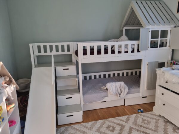 To niezwykłe łóżko piętrowe nie tylko zapewnia miejsce do snu, ale także staje się centrum zabawy i radości dla Twojego malucha. Solidna konstrukcja z daszkiem nad górnym łóżkiem zapewnia wyjątkowy komfort i bezpieczeństwo podczas snu, podczas gdy schodki umożliwiają łatwy dostęp do górnej części.